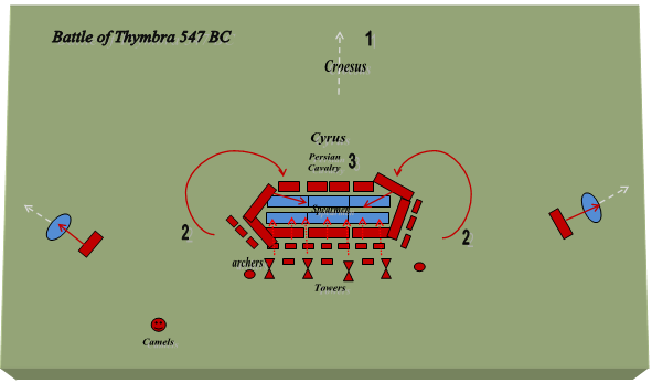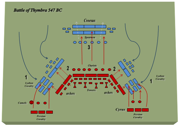 1. 크로이소스는 처음에는 측면의 보병들이 따라잡을 수 있도록 기병이 멈출 것을 요구했지만 페르시아 군이 그림과 같은 대형을 채택하면서 다시 전진하여 리디아 측면과 중앙 사이에 틈이 생겼다. 리디아 기병대는 페르시아 군의 후방에 들어갈 기회를 보고 안쪽으로 돌기 시작했다. 질주하는 기병에 의해 솟아오른 큰 먼지 구름 때문에 그들은 뒤늦게 진격하는 키루스의 기병을 알아채지 못했다. 측면의 페르시아 기병과 전차 모두 오른쪽의 키루스, 왼쪽의 히스타스피스 아래에서 돌격했다. 그들은 측면으로 기습하여 리디아 기병을 가두었다.