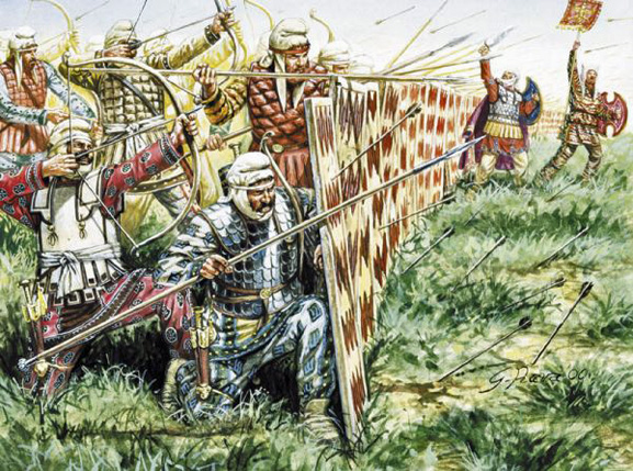 2. 처음의 보병과 기병의 공격은 진행되었지만, 대형 안에 있는 타워와 페르시아 궁병들의 끊임없이 쏟아지는 화살로 인해 수렁에 빠졌다.