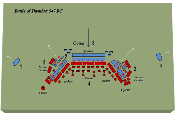 2. 키루스는 이제 이집트 창병을 둘러싸고 화살을 퍼부었다. 그러나 그들은 계속해서 저항했다. 그들의 끈기에 감명을 받은 키루스는 그들에게 페르시아 군에 들어올 것을 제의했다. 그들은 크로이소스와 싸우지 않아도 된다는 조건으로 제안을 받아들이고 항복했다.