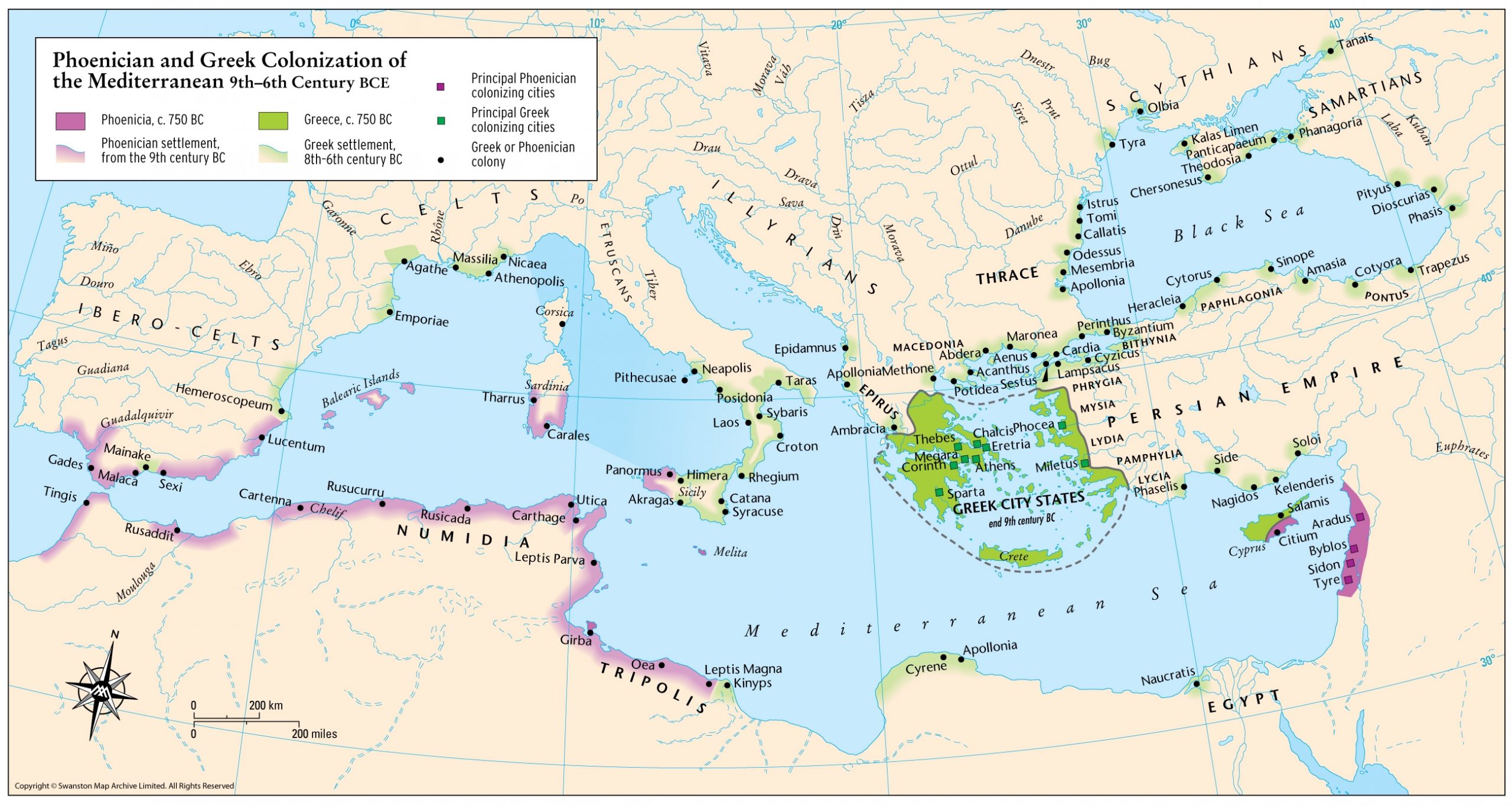 이 지역에서 그리스 식민지 개척의 두 번째(아마도 세 번째) 물결은 BC 750년 이탈리아의 쿠마를, BC 735년 시칠리아의 낙소스를 세우기 시작했다. 그 후 100년 동안 여러 그리스 도시가 이탈리아 남부 해안과 대부분의 시칠리아 해안을 따라 식민지가 세워져 이 지역 주변의 무역로를 통제하고 메시나 해협을 지배할 수 있는 자리를 확보했다. 에트루리아인이 그리스인과 충돌했지만 그 과정을 멈출 수 없었다. 식민지화 과정이 계획적으로 이루어지지는 않았지만 여러 그리스 도시가 동시에 활동하면서 페니키아인과 에트루리아인에게 그리스인의 홍수가 티레니아 해안을 뒤덮는 것처럼 보였다.