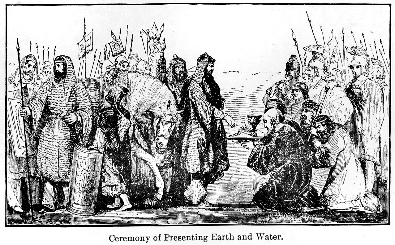 "이오니아 사람들이여, 이제 당신들 각자가 왕을 잘 섬겼다는 것을 보여 달라. 여러분 각자가 자신의 동포를 나머지 동맹 세력으로부터 떼어놓도록 하라. 그들에게 이 약속을 하라. 그들은 반역으로 인한 아무런 해도 입지 않을 것이며, 그들의 신전이나 집도 불에 타지 않을 것이며, 어떤 식으로든 전보다 더 폭력적으로 대우받지도 않을 것이다. 그러나 그들이 그렇게 하지 않고 싸우려고 한다면, 그들을 제지할 위협을 말하라. 그들이 전투에서 패배하면 노예가 될 것이다. 우리는 그들의 아들을 내시로 만들고 처녀들을 박트라에 포로로 데려갈 것이며 그들의 땅을 다른 사람들에게 넘겨줄 것이다."