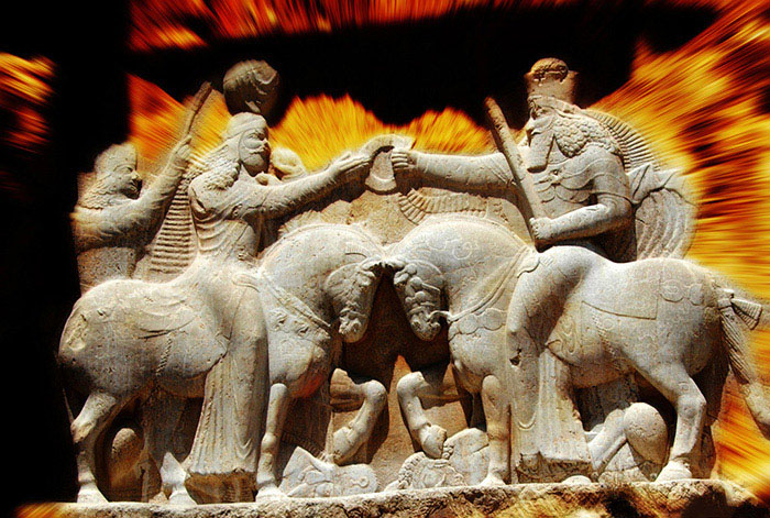 아래의 고대 그림은 로마 황제 발레리아누스와 원로원 의원이 페르시아의 샤푸르 왕(말을 타고 있는)에게 항복하는 모습을 보여주고 있다. 발레리아누스 황제가 무릎을 꿇고 페르시아의 샤푸르 왕에게 자비를 구하고 있는 가운데 페르시아의 여성 기병 장교(왼쪽)가 수렌 일족의 귀족(높이 솟은 모자를 쓰고 있는)과 함께 지키고 있다. 로마는 노예제도와 전쟁 포로 및 피를 기반으로 한 경제를 가진 잔인한 제국이었고 그들의 주된 목표는 페르시아를 정복하는 것이었지만 양측을 약화시키고 많은 생명을 앗아간 끝없이 잔혹하고 불필요한 많은 전쟁에도 불구하고 성공하지 못했다.