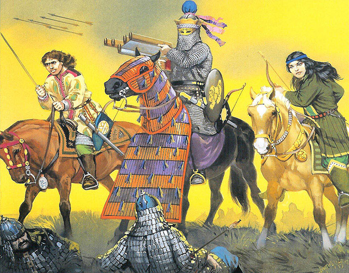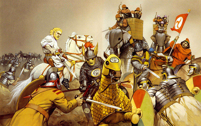 아래의 고대 그림(앵거스 맥브라이드)은 사산조 페르시아 정예 전사들의 매복 공격(사마라 전투)에서 로마 황제 율리아누스가 치명상을 입은 모습을 보여주고 있다. 여기에서 금갑 군마와 코끼리가 로마 군대에서 공황과 혼란을 일으키는 것을 분명히 볼 수 있다.