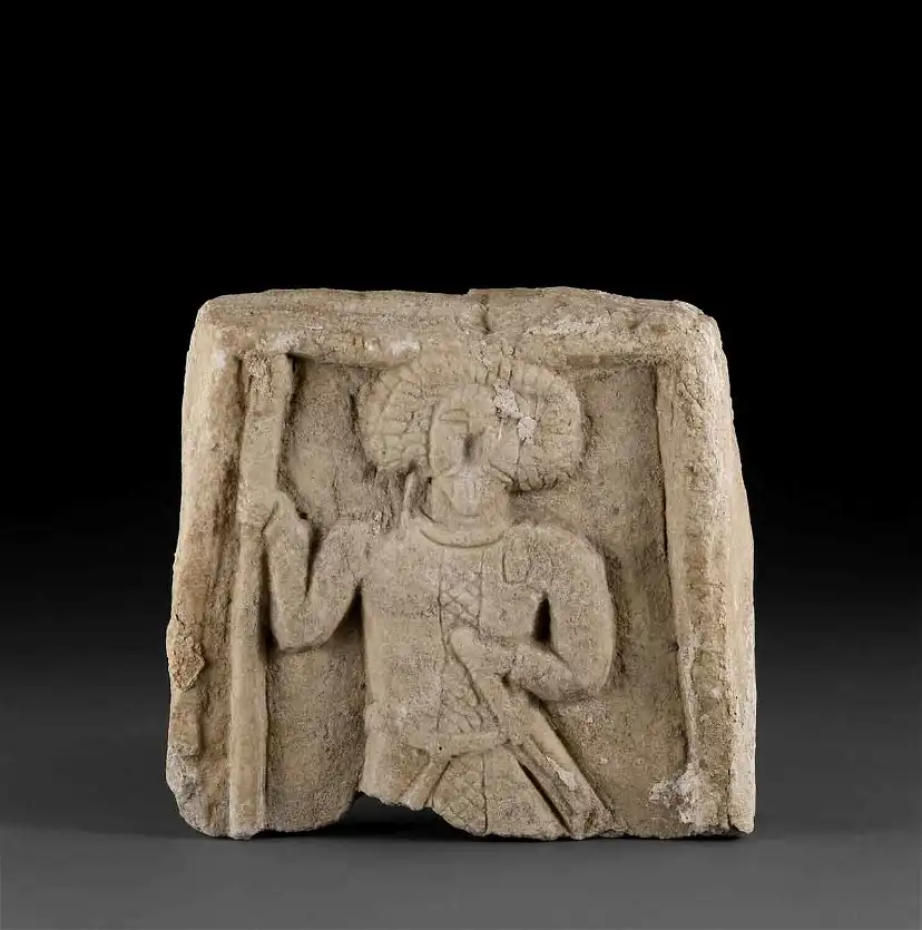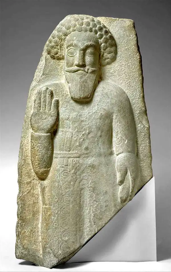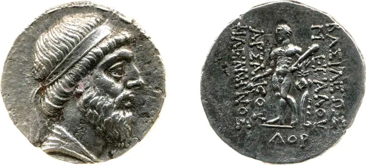 파르티아의 샤한샤(왕중왕) 미트리다테스 1세의 은화, 헬레니즘적인 왕관을 쓴 통치자의 두상(앞면), 나체의 헤라클레스가 서 있는 모습(뒷면), BC 165-132년경, 출처 대영 박물관