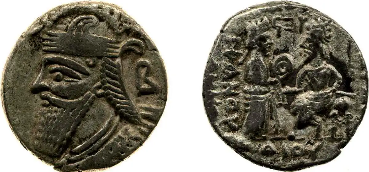 볼로가세스 4세의 은화, 페르시아식 턱수염을 자랑하는 통치자의 두상(앞면), 왕좌에 앉은 왕, 왕관과 홀을 들고 그 앞에 서 있는 티케, 154-155년, 출처 대영 박물관