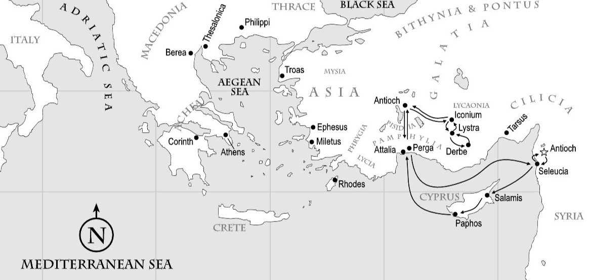 45-49년? 바나바와 바울의 선교(행 13:1-14:28), 키프로스, 피시디아의 안티오키아, 이코니움, 리스트라(그곳에서 그들은 '신들이 사람의 형상으로...'라고 불림), 데르베를 거쳐 안티오키아로 돌아오다