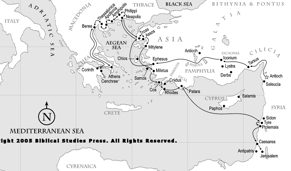 53-57년? 바울의 세 번째 선교(행 18:23-22:30), 갈라티아, 프리기아, 코린토스, 에페소스, 마케도니아, 그리스를 거쳐 반율법주의를 전파한다는 소문에 대해 그에게 도전한 주의 형제 야고보(행 21:21)가 있는 예루살렘으로 가서 군중에게 그들의 언어(아마도 아람어)로 연설하다. 로마서, 고린도전서, 고린도후서, 빌립보서를 기록하다?