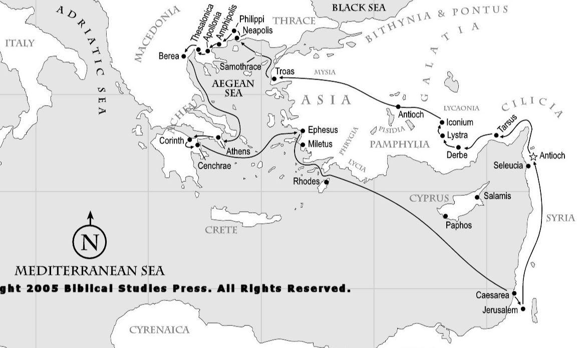 50-53년? 바울의 두 번째 선교(행 15:36-18:22), 바나바와 갈라선 후 프리기아, 갈라티아, 마케도니아, 필립포이, 테살로니카, 베레아, 아테네, 코린토스를 거쳐, "그가 한 서원 때문에 켄크레아에서 머리를 깎았다", 데살로니가전서, 갈라디아서를 기록한? 안티오키아로 돌아오다. 자주 장사 티아테이라의 루디아가 유럽 최초의 기독교 개종자가 되다(행 16:11-15)
