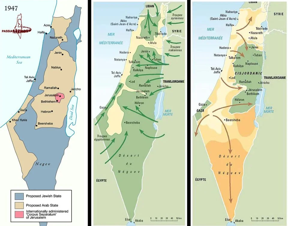 - 첫 번째 지도: UN이 제안한 분할 지도. 푸른색: 이스라엘 영역, 짙은 베이지색: 아랍 영역, 다홍색: 예루살렘 UN 관리 구역