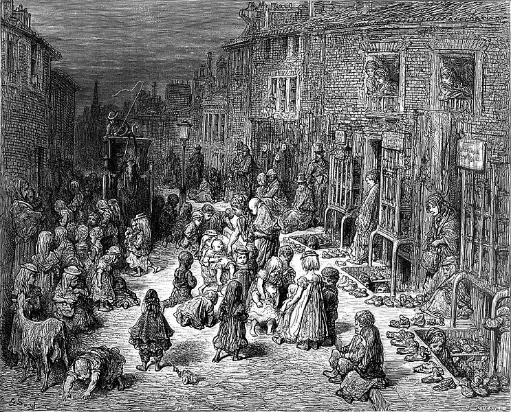 19세기 초 런던에서 가장 악명 높은 빈민가 중 하나인 세븐 다이얼스"Seven Dials"의 더들리 스트리트를 묘사한 귀스타브 도레의 판화(1872). 시인 존 키츠는 그곳을 "약간의 따뜻함을 위해 비참함이 비참함에 달라붙고, 궁핍과 질병이 나란히 누워 함께 신음하는 곳"이라고 묘사했다.