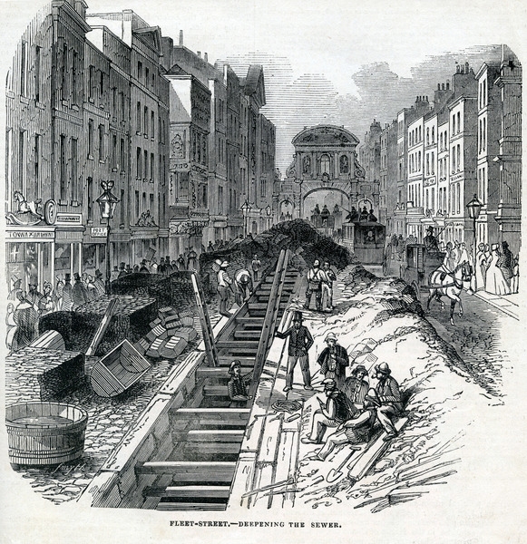 1845년 플리트 스트리트의 하수구를 깊게 하는 공사. 런던의 하수구 대부분은 1859년 이후 토목 기사 조셉 바잘제트의 지시에 따라 만들어졌다. 그와 그의 동료들은 폐기물을 런던 중심부 하류의 템스 하구로 보내는 광범위한 지하 하수도 시스템을 설계했다. 6개의 주요 차단 하수관이 건설되었고, 일부는 플리트를 포함하여 런던의 "사라진" 강들을 통합했다. 차단 하수관은 메인 하수관의 내용물과, 차례로 더 작은 지역 하수관의 내용물을 운반하면서 총길이가 약 21,000km에 달했다. 포틀랜드 시멘트가 터널을 강화하는 데 사용되었으며, 150년 이상 지난 오늘날에도 양호한 상태이다.