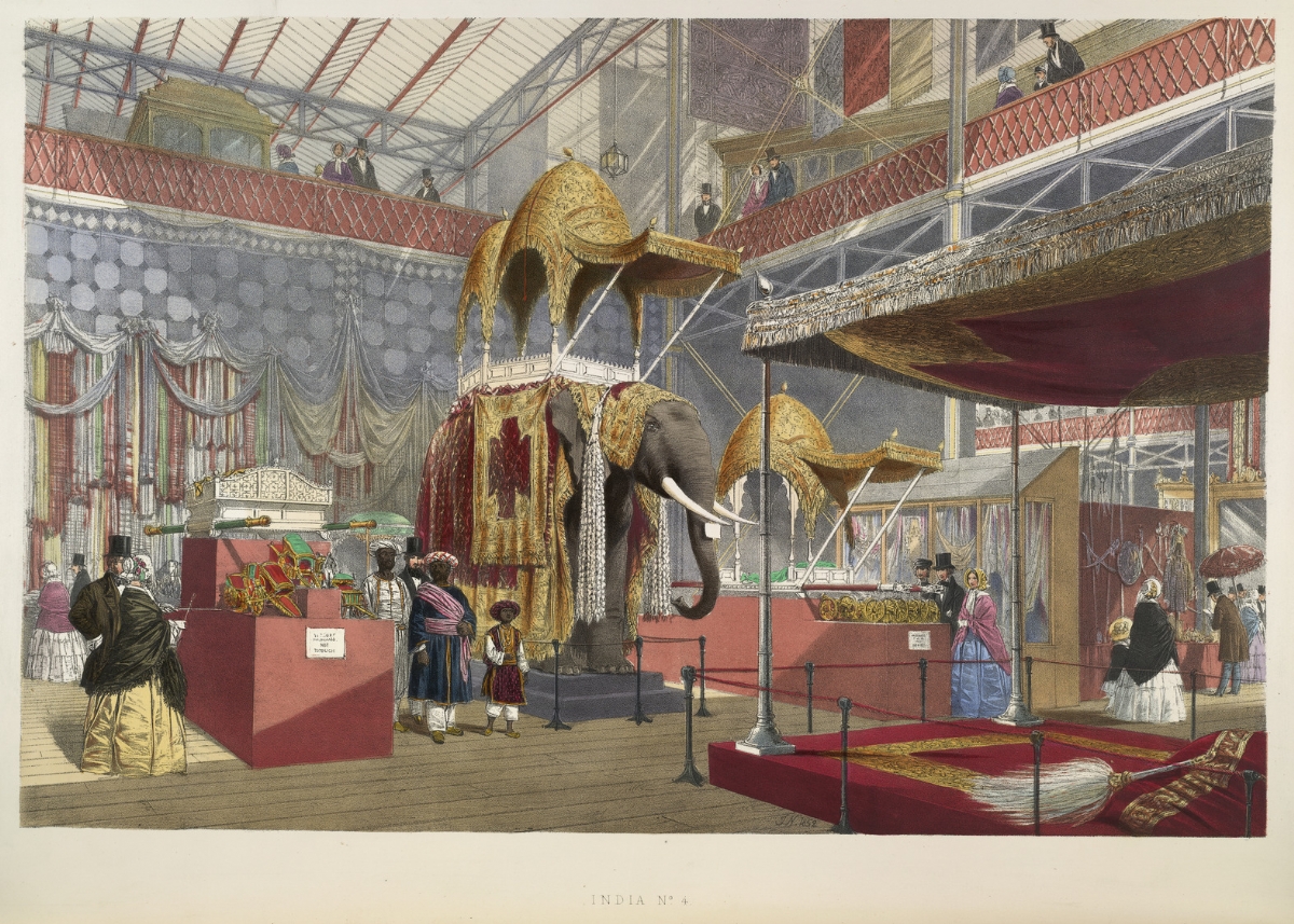 만국 박람회에서 인도 전시의 일부. 영국의 산업적 성과를 기념하기 위해 개최된 만국 박람회가 1851년 빅토리아 여왕에 의해 개관한 하이드 파크의 크리스털 팰리스로 알려진 유리 홀에서 열렸다. 13,000개 이상의 전시업체가 다양한 산업제품을 전시했다.