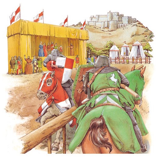 기사들의 마상 창 시합. 마상 창 시합은 기사들이 연습한 자신의 기술을 뽐낼 수 있는 기회인 토너먼트, 즉 마상 시합에서 열렸다. 마상 창 시합은 300보 떨어진 거리에 있는 말에 올라탄 두 명의 기사가 틸트라고 불리는 장벽의 양쪽에서, 리스트라고 불리는 좁은 레인을 따라 서로를 향해 돌진했다. 그 목적은 둔탁한 나무로 된 랜스(긴 창)를 사용하여 상대방을 말에서 떨어뜨리는 것이었다.