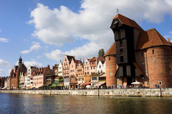 중세 한자 동맹도시 폴란드 그단스크의 해안가. 오른쪽의 큰 건물은 배에서 물품을 하역하는 데 쓰였던 15세기의 항구 크레인(폴란드어로 주라프"zuraw")이다.