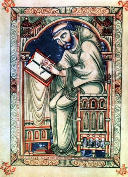 수도승 서기관이 필사 작업을 하고 있다. 이 채색은 1160년경 잉글랜드 캔터베리에서 제작된 에드윈 시편"Eadwine Psalter"(시편 및 기타 종교 자료를 포함하는)에서 발췌한 것이다.