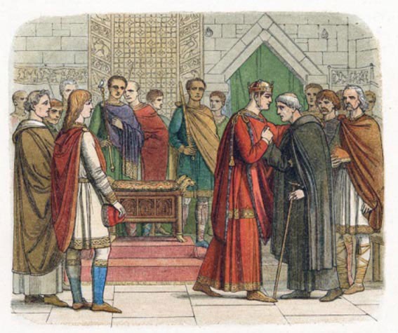 윌리엄 1세(그림에서 빨간 옷을 입고, 정복자 윌리엄으로 알려진)가 자신의 새로운 왕국인 잉글랜드에서 귀족과 성직자들을 만나고 있다.