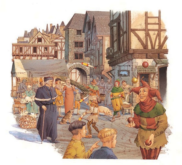 장날 아침에 시장은 소음과 냄새로 활기가 넘쳤다. 그러나 돼지들이 성가신 존재였다. 대부분의 도시 사람들은 값이 싸고 좋은 식량 공급원이기 때문에 돼지들을 키웠지만, 종종 먹이를 찾도록 거리로 내보냈다. 중세 도시의 거리는 더럽고 냄새가 났다. 덮개가 없는 배수로가 거리의 측면이나 중앙을 따라 흘렀고, 사람들은 종종 창문 밖으로 오물을 버렸다. 특히 장날에는 거리도 활기찬 장소였다. 저글링하는 사람들, 어릿광대, 심지어 춤추는 곰까지 군중을 즐겁게 했다.