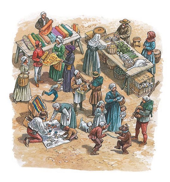 장날은 중세 도시에서 한 주 중 가장 바쁜 날이었다. 지역 농부들은 말이 끄는 이륜 수레를 이용하여 고기와 채소를 팔기 위해 도시로 왔고, 상인들은 고운 옷감과 기타 상품들을 팔기 위해 더 먼 곳에서 왔다. 거래 상품 중 중세 초기에 가장 비싸고 탐나는 염료는 바다 달팽이로 만든 보라색이었다. 하지만 인기가 떨어지면서 11세기에 케르메스 벌레로 만든 진홍색으로 대체되었다. 행상인들은 온갖 종류의 상품을 팔았다. 땜장이"Tinker"들은 냄비와 팬을 수리하곤 했다.