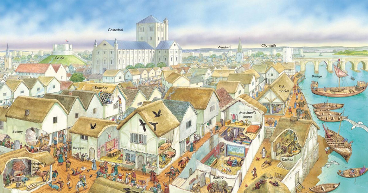 중세 도시의 부분 단면도 그림은 대장간, 빵집, 여관 및 상점으로 둘러싸인 시장을 보여준다. 배경에 대성당과 영주의 성이 있다.