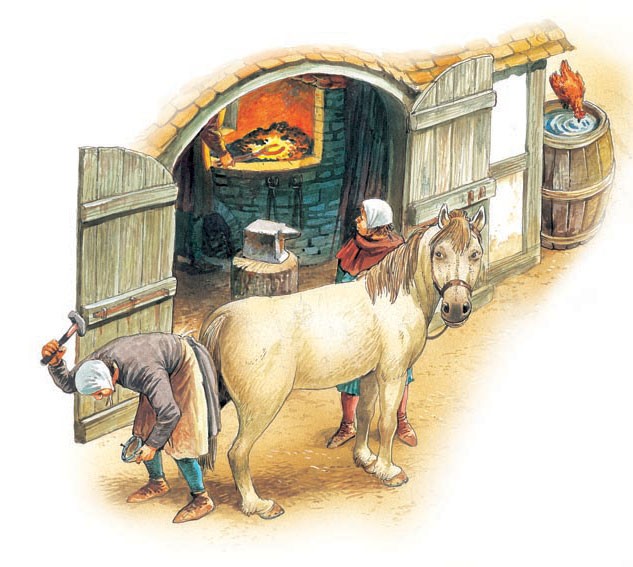 중세의 모든 도시에는 대장간이 있었다. 이곳에서 대장장이들은 도구, 무기, 갑옷, 편자 및 그 밖의 금속 제품들을 만들기 위해 쇠를 망치로 두드리거나 구부리거나 자르는 일을 했다. 벽돌로 만든 화덕에는 숯불이 타오르고 있었고, 풀무에서 뿜어져 나오는 공기의 폭발로 뜨겁게 타오르는 상태를 유지했다. 금속은 빨갛게 빛날 때까지 가열하여 부드러워지면 모루 위에서 두들기거나 구부려 모양을 만들었다. 말에 편자를 대기 위해 오래된 것은 제거하고, 고르지 않은 발굽을 줄로 다듬은 후에 새 편자를 제자리에 단단히 고정시켰다.