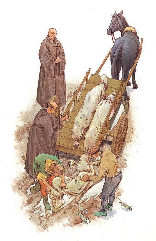 1347-1349년 사이에 선 페스트라고 불리는 끔찍한 질병이 아시아를 휩쓸고 유럽 전역으로 퍼져 수천만 명의 목숨을 앗아갔다. 이는 흑사병으로 알려졌다. 중세 도시에서는 질병이 흔했다. 사람들이 빽빽하게 모여 살면서 흙이나 오물을 씻어낼 흐르는 물이 없었다. 가장 흔한 증상은 사타구니와 목, 겨드랑이에 부종이 생기면서 고름이 배어 나오고 피가 났다. 검은 쥐에 기생하는 벼룩에 있던 세균이 이 병을 옮겼지만, 당시에는 아무도 그 사실을 알지 못했다. 사람들이 감염된 마을과 도시에서 도망쳐 나와 다른 곳으로 이동하면서 병을 퍼뜨렸다. 치료법은 없었고, 많은 사람들이 죽었다. 죽은 시체는 밤에 수레로 거두었다. 모든 마을과 도시의 인구가 급격하게 줄었다.