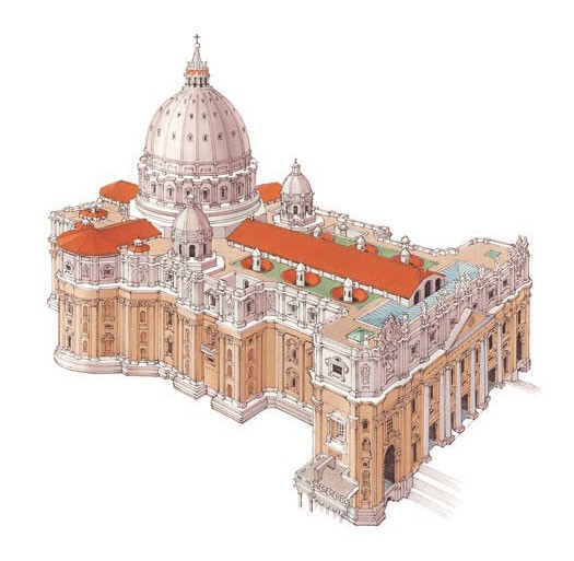 로마 성 베드로 대성당의 첫 번째 돌은 1506년 교황 율리우스 2세에 의해 놓였다. 르네상스 시대의 가장 위대한 건축가 중 일부가 그 설계에 참여했다. 여기에는 주 제단 위에 우뚝 솟은 웅장한 발다키노(캐노피)를 디자인한 브라만테, 미켈란젤로, 베르니니도 포함되었다. 그가 죽은 후 수십 년 뒤에 완성되었지만, 미켈란젤로는 132미터(433피트) 높이의 거대한 돔을 설계했다.
