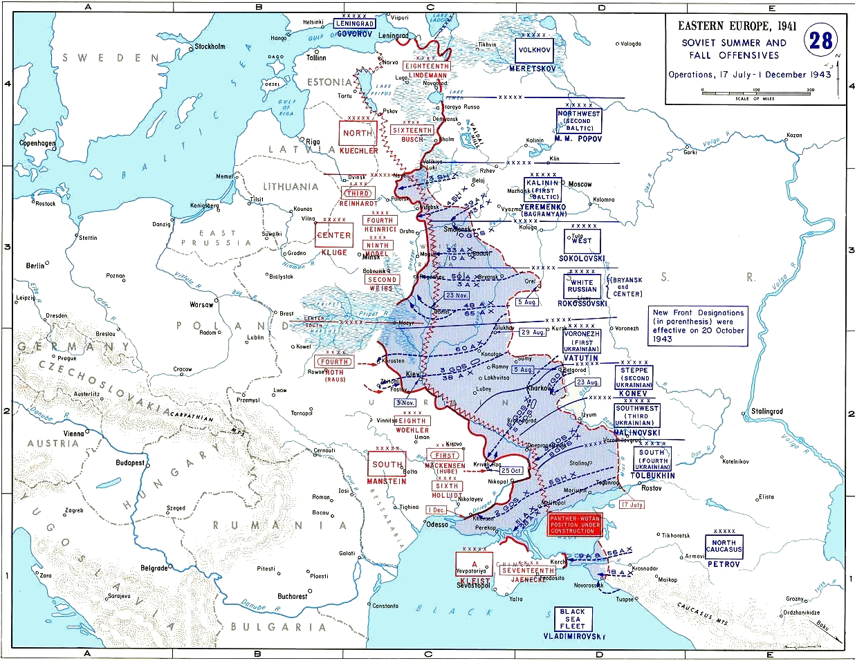 8월 26일-12월 23일 드네프르 전투 - 소련군이 드네프르 강으로 밀고 올라가 교두보를 빼앗았다.