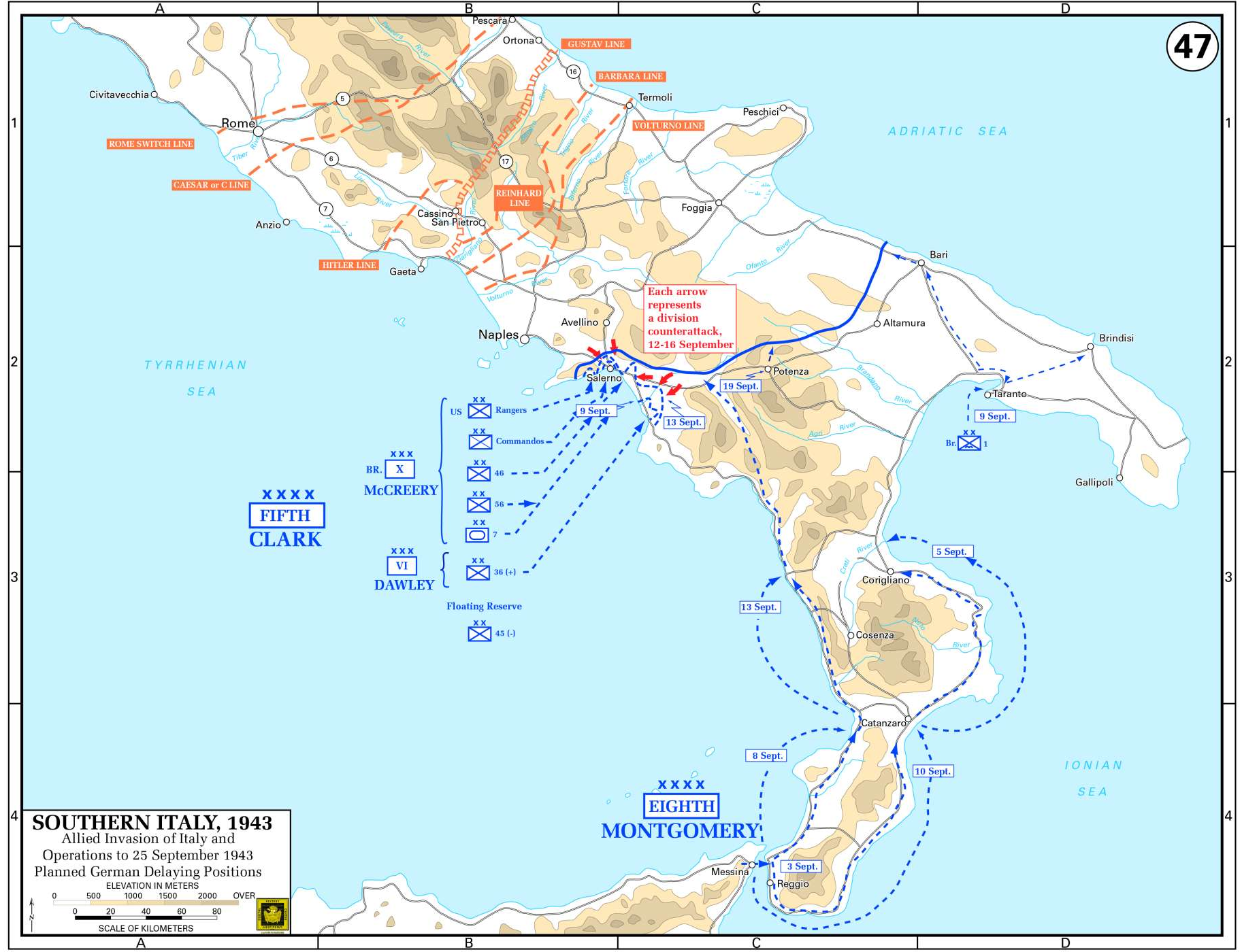 9월 8일 이탈리아 침공으로 연합군은 나폴리 바로 남쪽에 있는 살레르노라는 작은 마을에 상륙했다. 해안에 상륙한 미군의 첫 번째 물결이 확성기를 통해 영어로 "어서 항복하라. 우리는 당신들을 포위했다"라고 선언했지만, 이에 굴하지 않고 공격이 계속되면서 전술적 기습이 이루어지지 않았다는 것은 곧 명백해졌다.