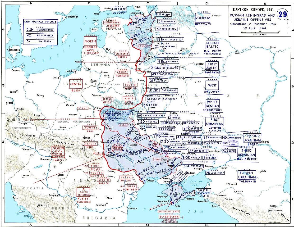 12월 24일-1944년 5월 6일 드네프르-카르파티아 공세 - 소련군이 드네프르 강의 교두보를 돌파하여 카르파티아 산맥을 향해 진격하고 우크라이나가 해방되었다.