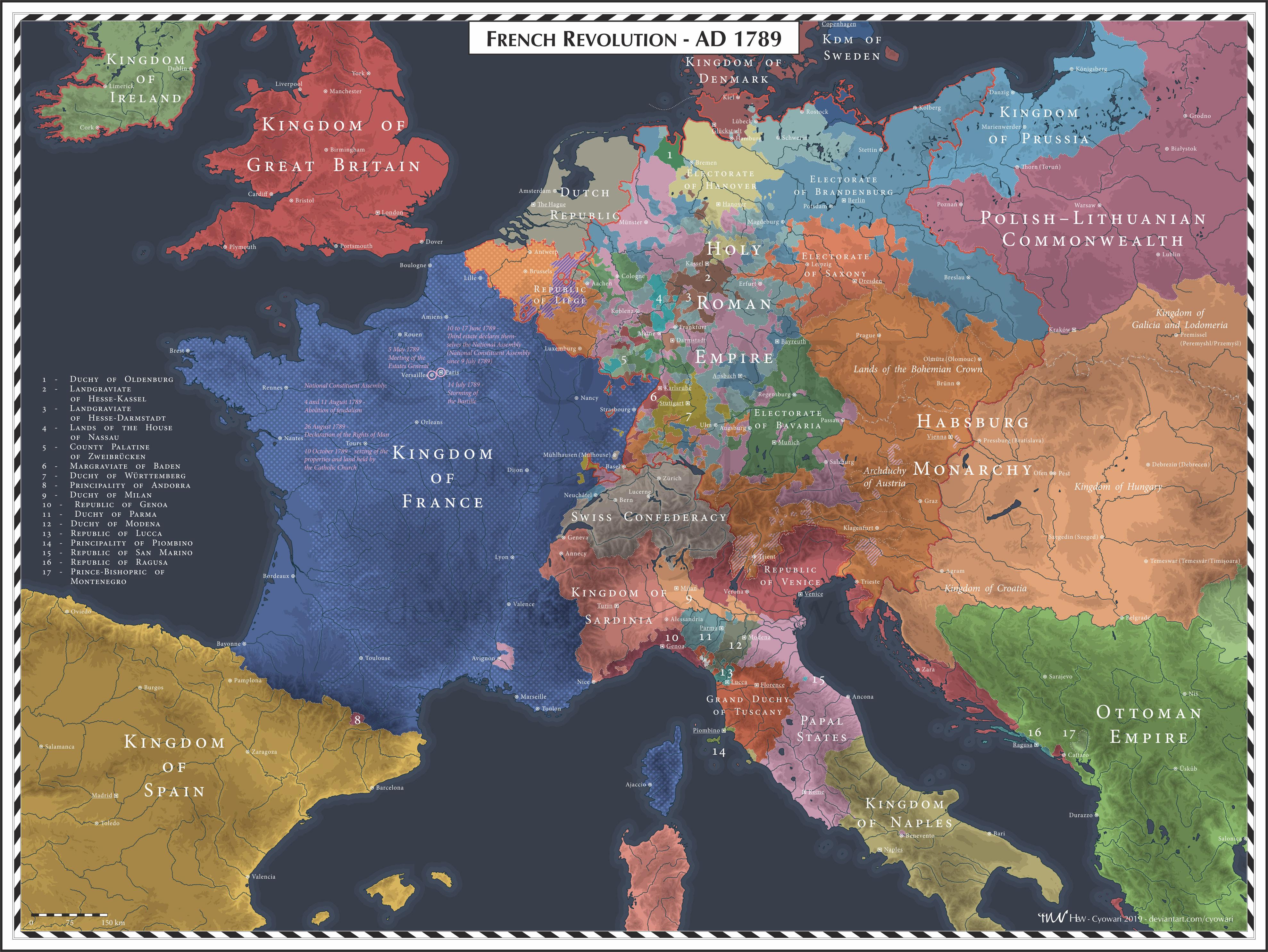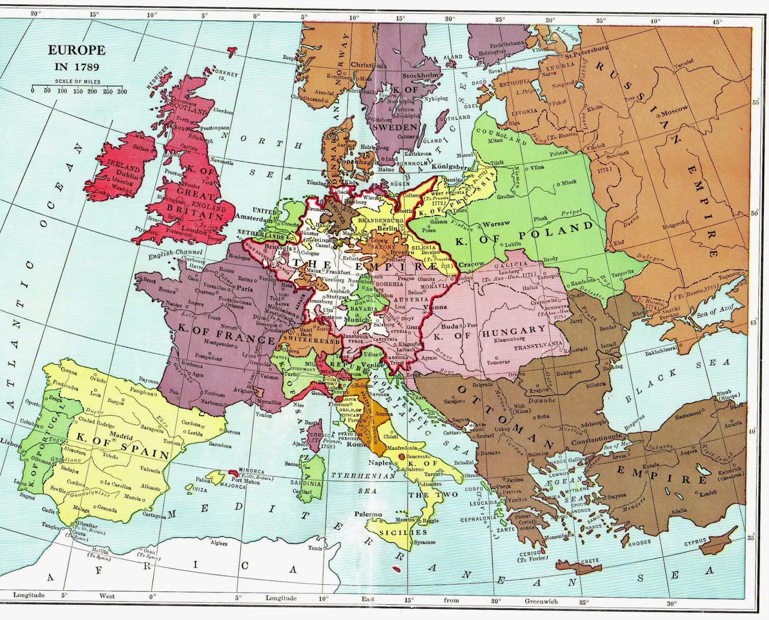 아래 지도는 프랑스혁명 전야의 유럽을 보여주고 있다.