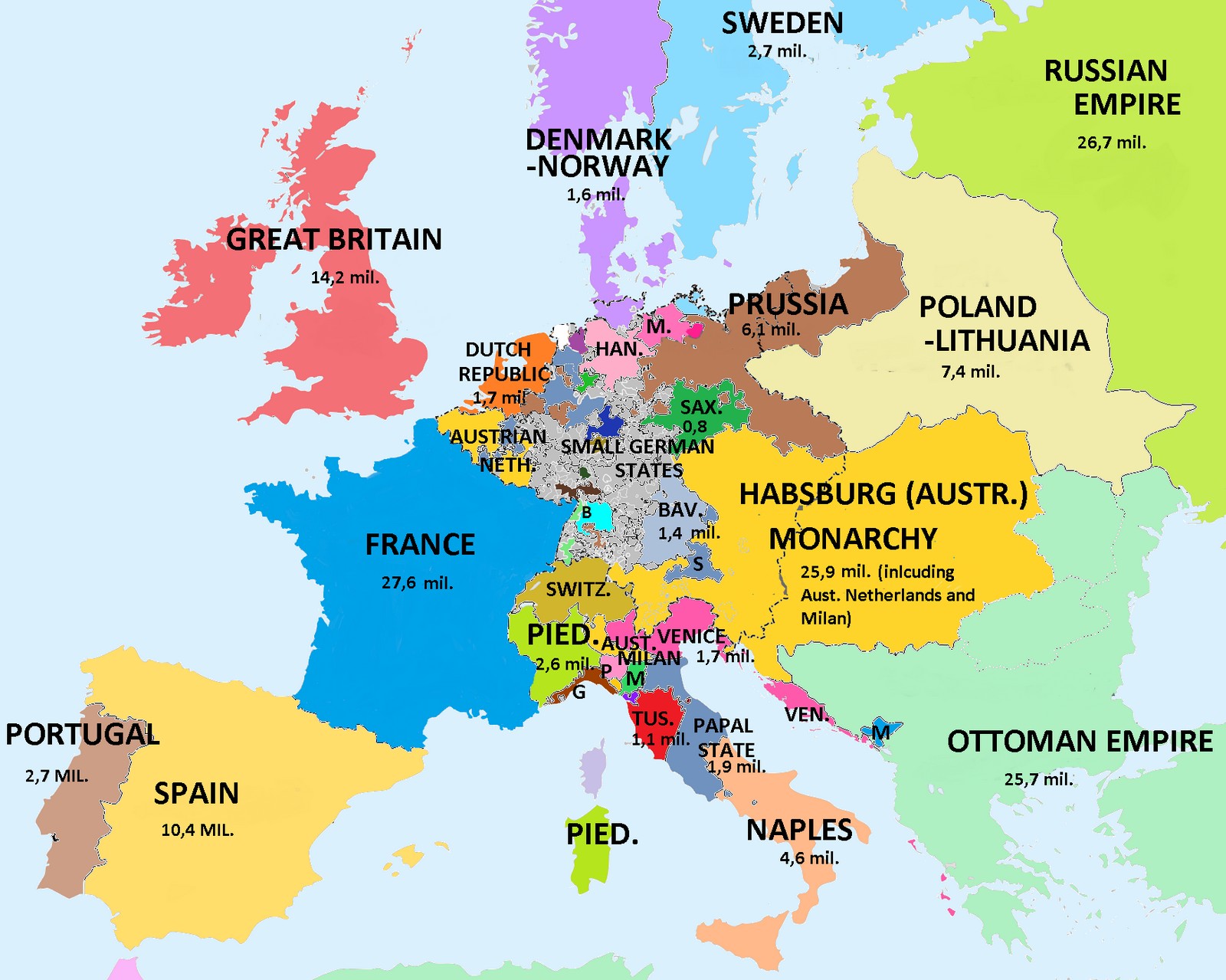 아래 지도는 프랑스혁명 직전 유럽 국가들의 인구를 보여준다.