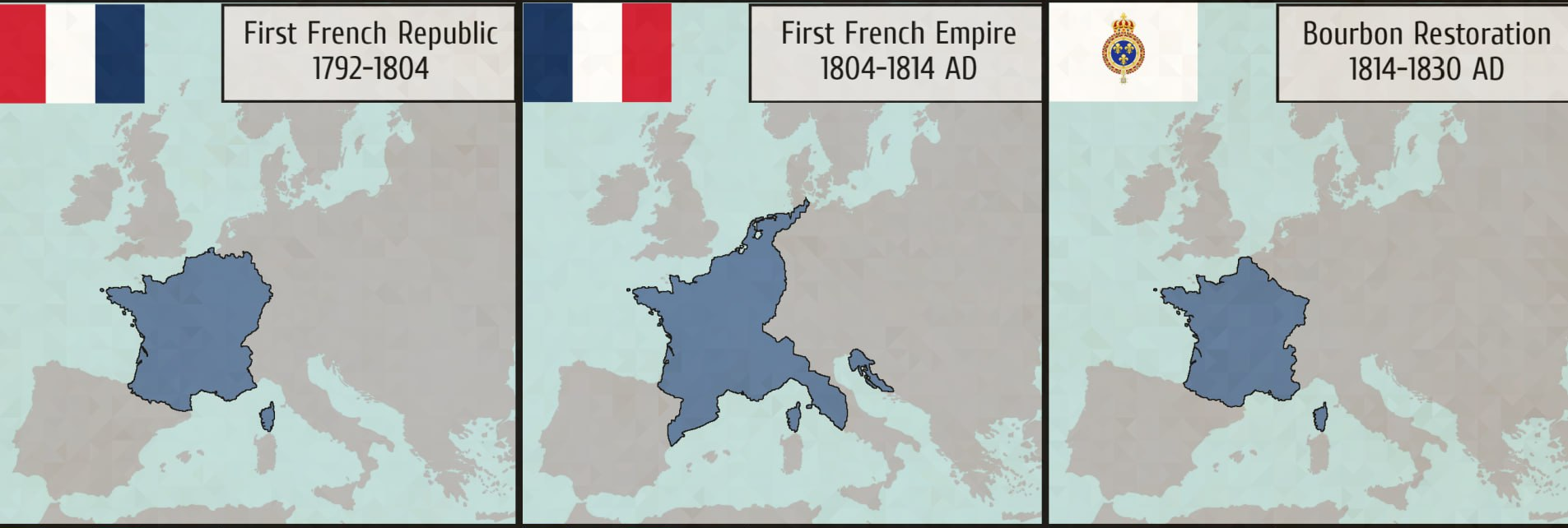 프랑스혁명과 나폴레옹 시대는 프랑스 영토 야망의 절정과 최악을 모두 목격했다. 그가 스페인에서 러시아 국경까지, 유럽 대륙의 많은 부분에 걸쳐 프랑스의 지배권을 확장하면서 나폴레옹 보나파르트의 정복은 유럽 지도를 재편했다. 그러나 나폴레옹 전쟁은 결국 패배로 끝났고, 많은 영토의 상실과 부르봉 왕정복고로 이어졌다.