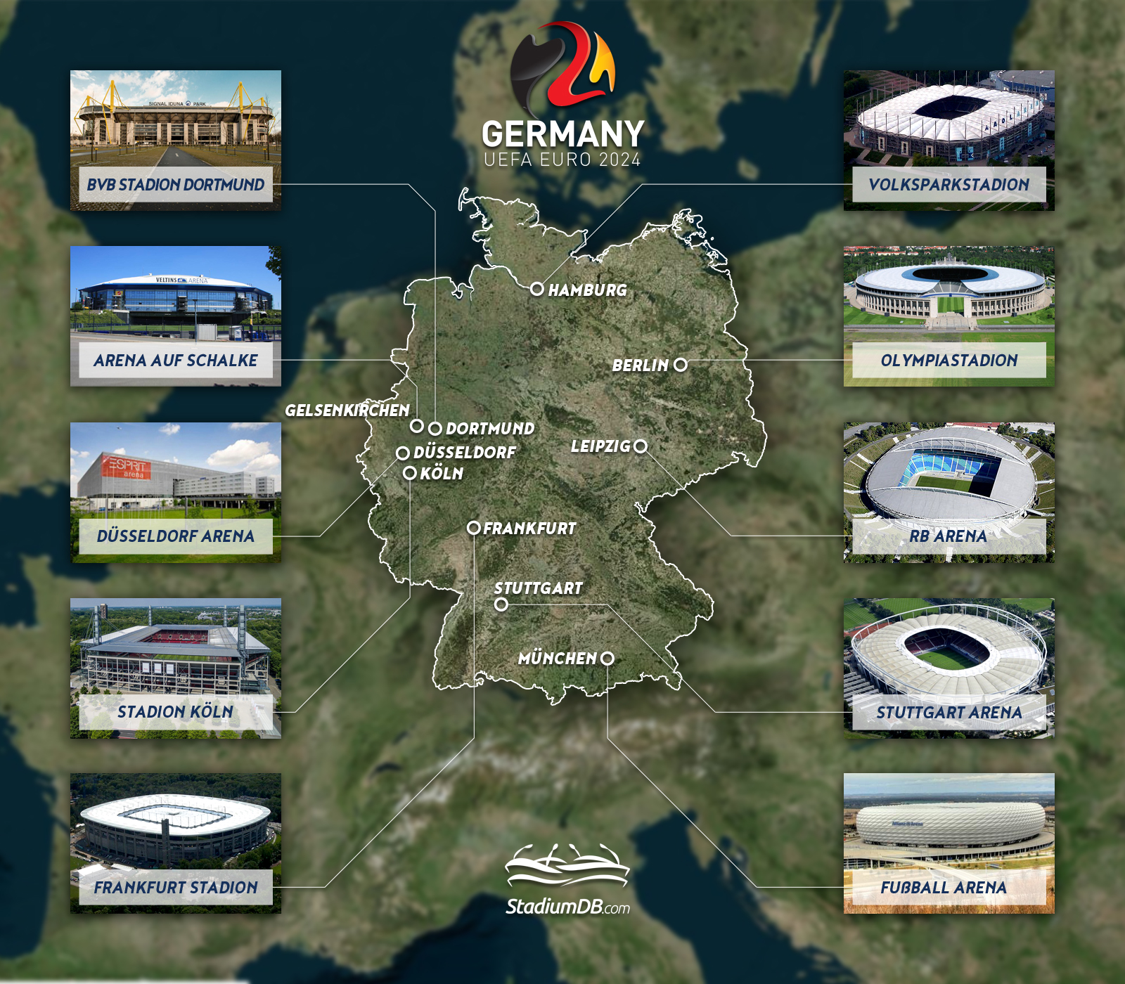 독일에게는 현재 형태로 치르는 첫 번째 유로이다. 베를린 장벽이 허물어지고 독일이 통일되기 불과 1년 전, 서독 시대에 대회를 한 차례 개최했다. 그런데 개최 도시 목록을 보면 묘하게 1988년과 유사하다.