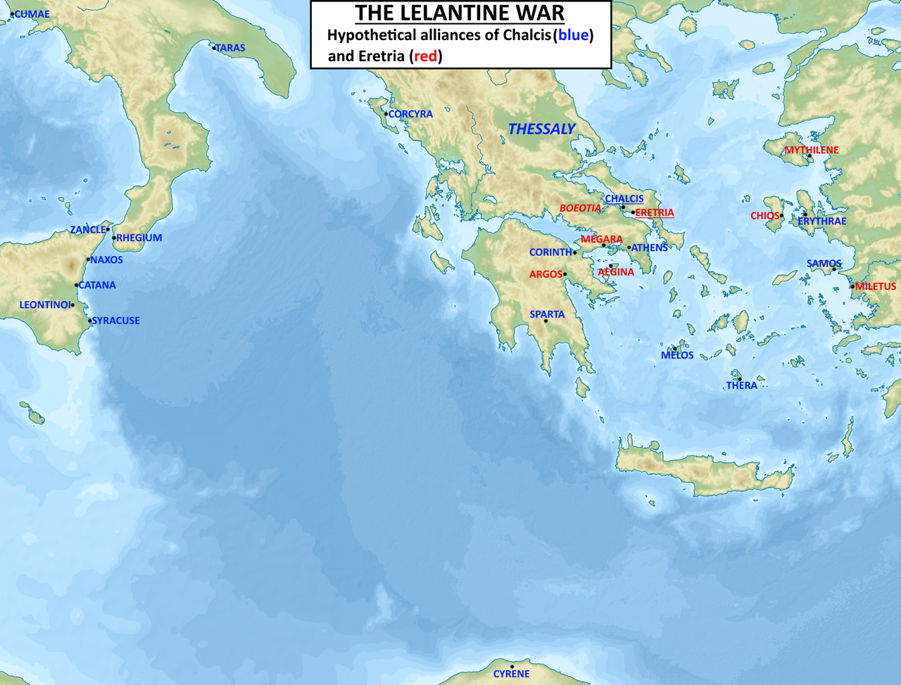 710년경 칼키스와 에레트리아 간에 렐란톤 전쟁이 발발했다. 많은 그리스 도시가 둘 중 하나와 동맹을 맺고 있다. 이 시기의 연대는 불확실하다
