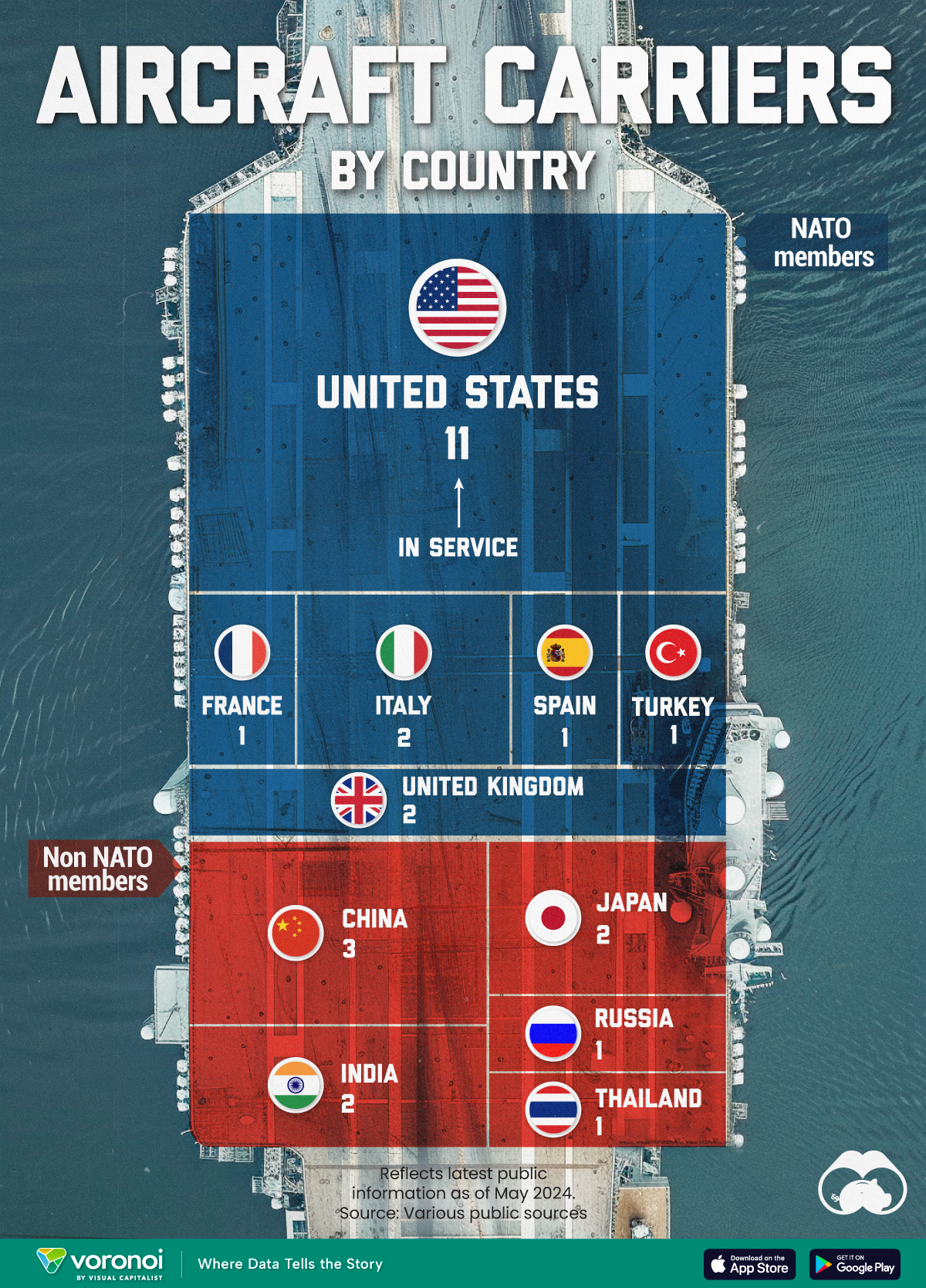 이 그래픽에서는 2024년 5월 기준 국가별로 취항 중인 항공모함의 수를 시각화했다.