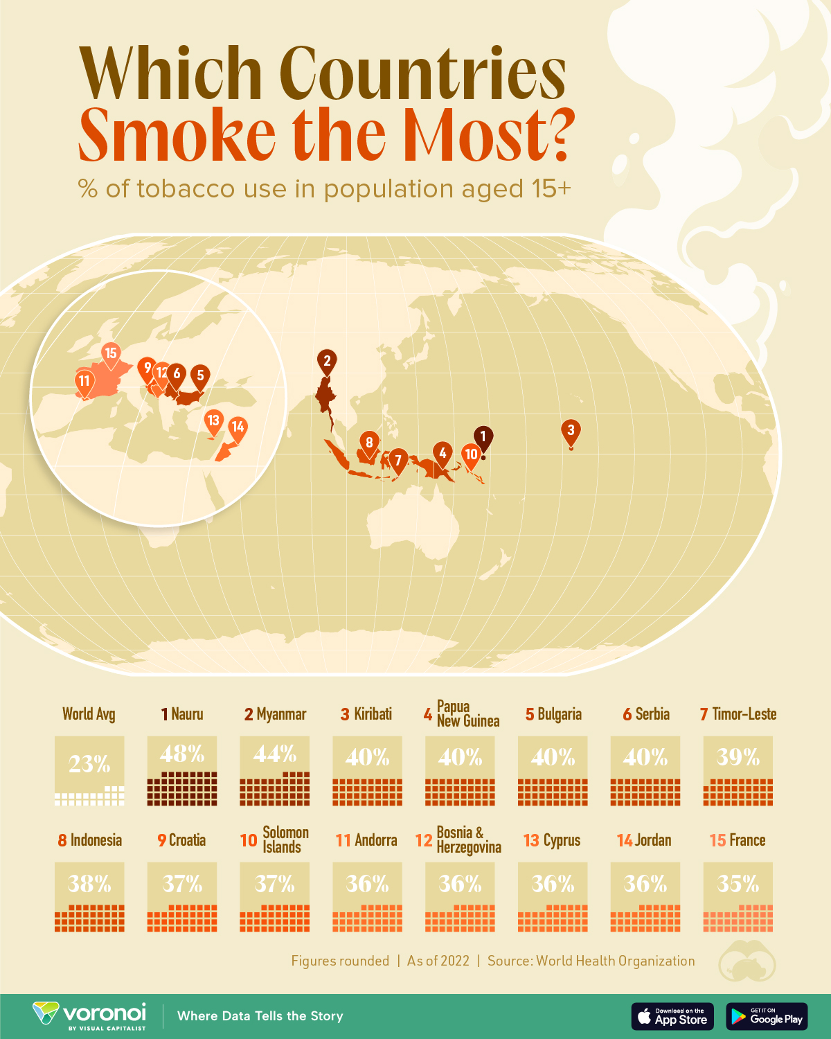 위는 15세 이상 인구 중 흡연율이 가장 높은 국가를 시각화한다. 데이터는 세계보건기구(WHO)에서 제공한 것이며, 2022년까지의 최신 데이터이다.