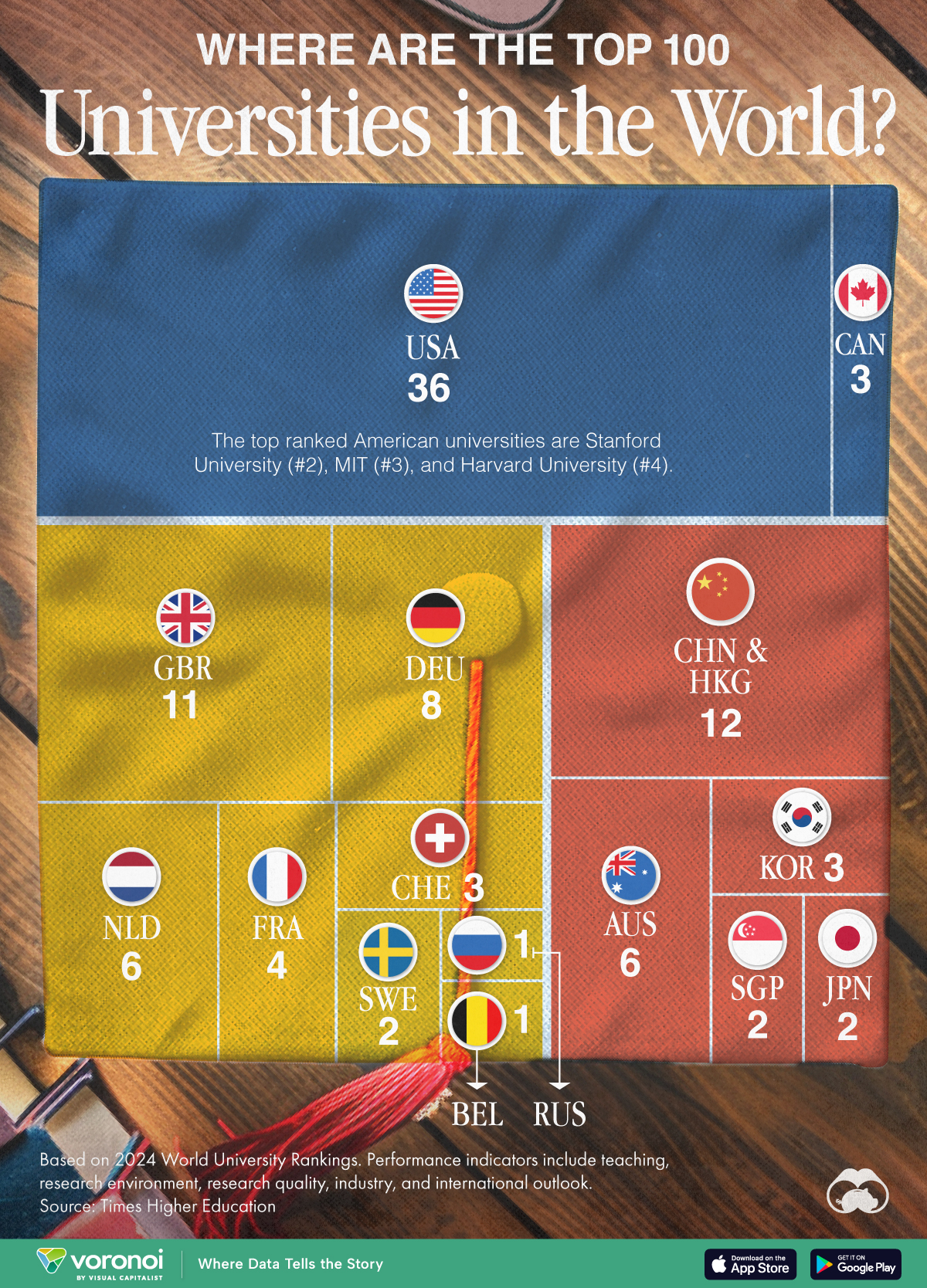 미국은 상위 100대 대학(36개)을 가장 많이 보유하고 있을 뿐만 아니라 2,000개에 가까운 학교의 전체 순위 카탈로그에서 가장 많이 대표되는 국가(169개 대학)이기도 하다.