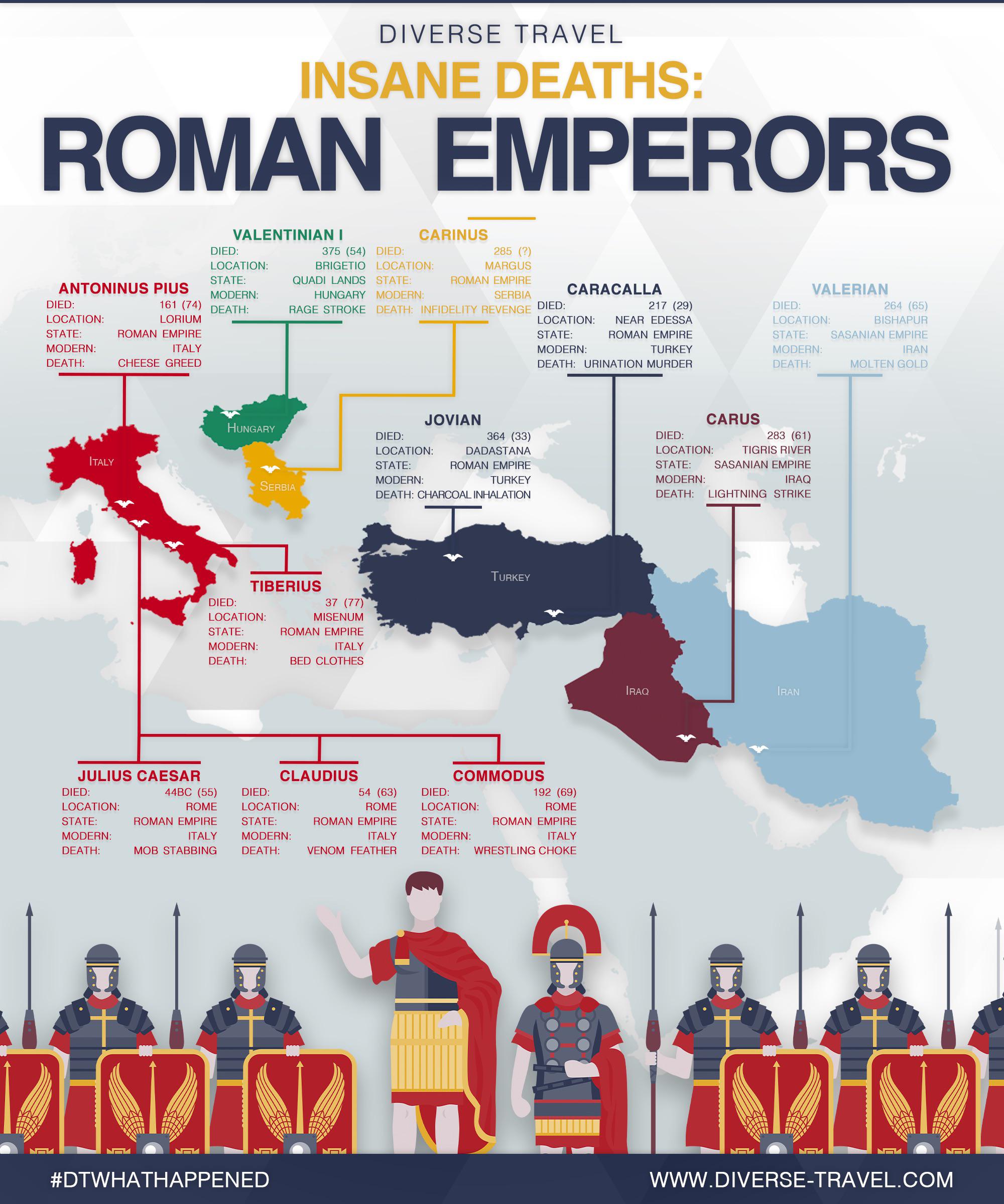 로마 황제들의 삶은 그들이 통치한 제국만큼이나 극적이었다. 음모와 배신, 전투는 많은 이들의 운명을 결정지었다. Reddit 유저 DiverseTrave가 만든 흥미로운 지도는 로마 제국 역사상 가장 이례적인 죽음의 장소와 상황을 보여준다.