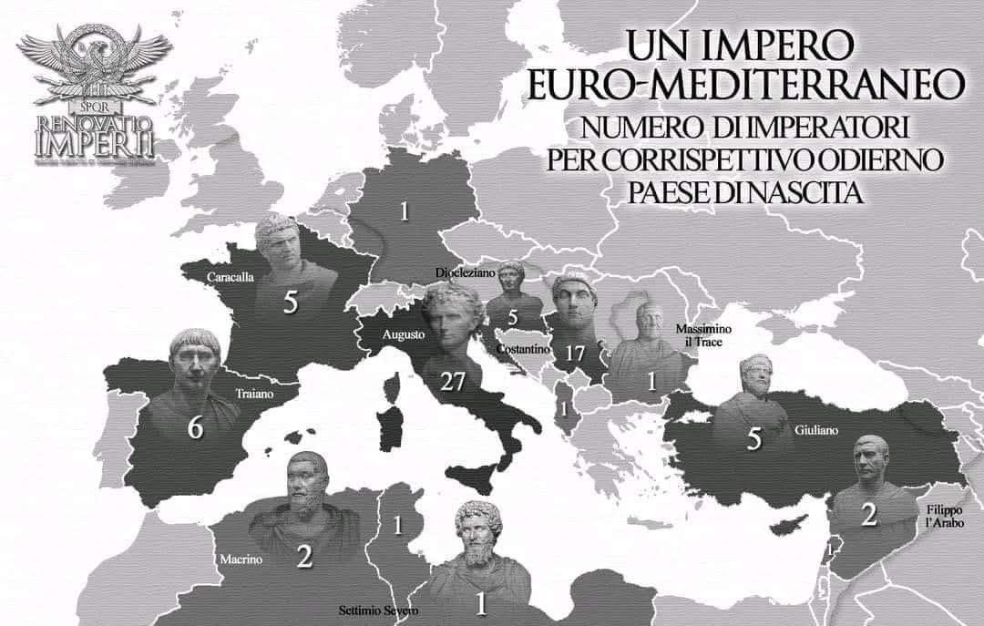 · 이탈리아: 당연하게도 초기 황제 중 상당수는 로마 제국의 심장부인 이탈리아 출신이었다. 초대 황제 아우구스투스는 로마에서 태어났다. 티베리우스, 베스파시아누스, 티투스, 마르쿠스 아우렐리우스와 같은 다른 황제들도 이탈리아 출신이다. 콘스탄티노폴리스를 건설하여 제국의 중심을 동쪽으로 옮긴 콘스탄티누스 대제도 나이수스(오늘날 세르비아 니시)에서 태어났지만 가문의 뿌리는 이탈리아로 거슬러 올라간다.