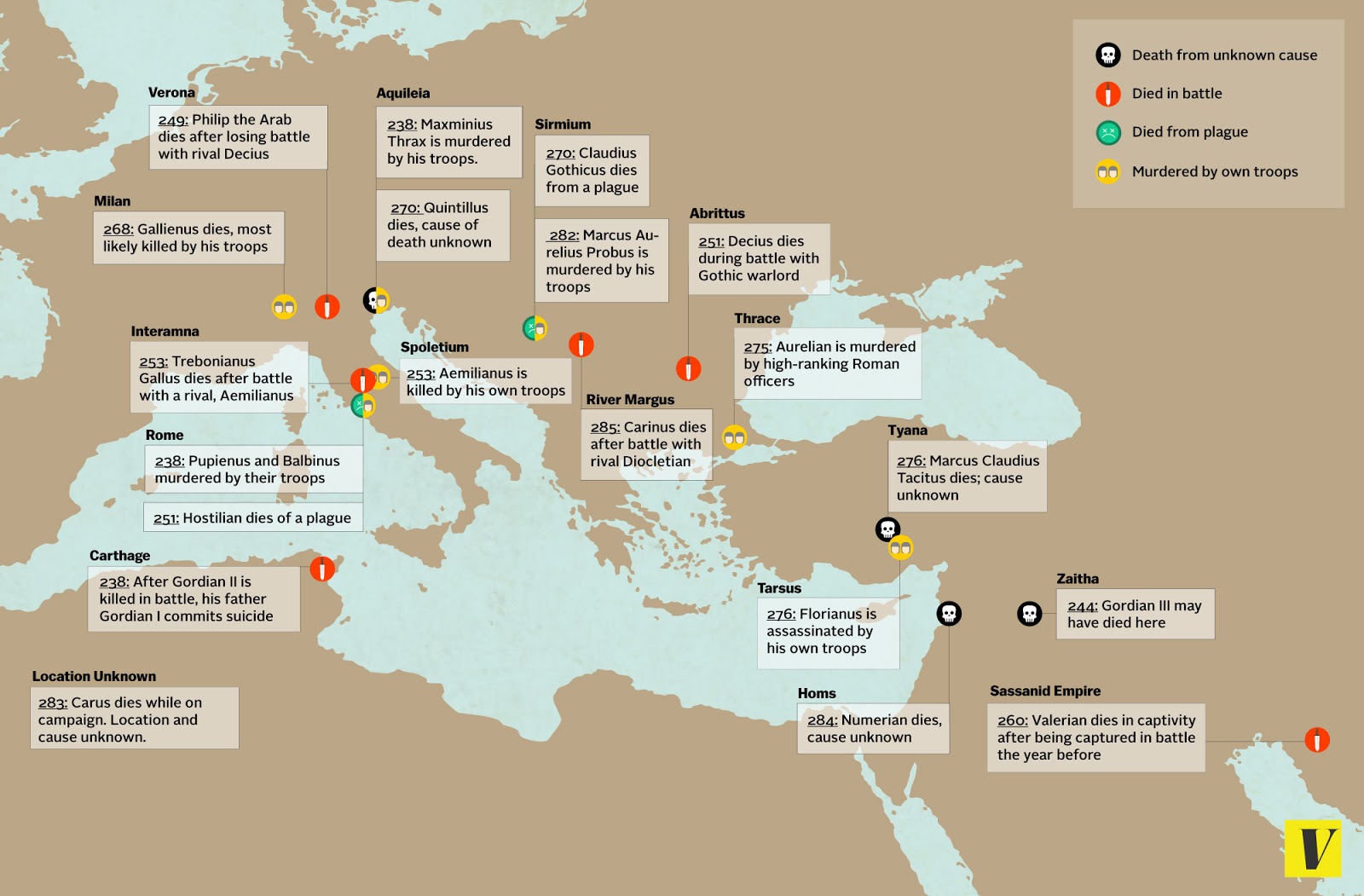 Vox 팀이 만든 또 다른 지도에는 "3세기의 위기"로 특징지어지는 격동의 3세기를 자세히 보여준다. AD 238년에서 285년 사이에 20명이 넘는 황제가 통치하고 그중 다수는 폭력으로 사망했으며, 제국은 내부와 외부의 혼란에 직면했다.