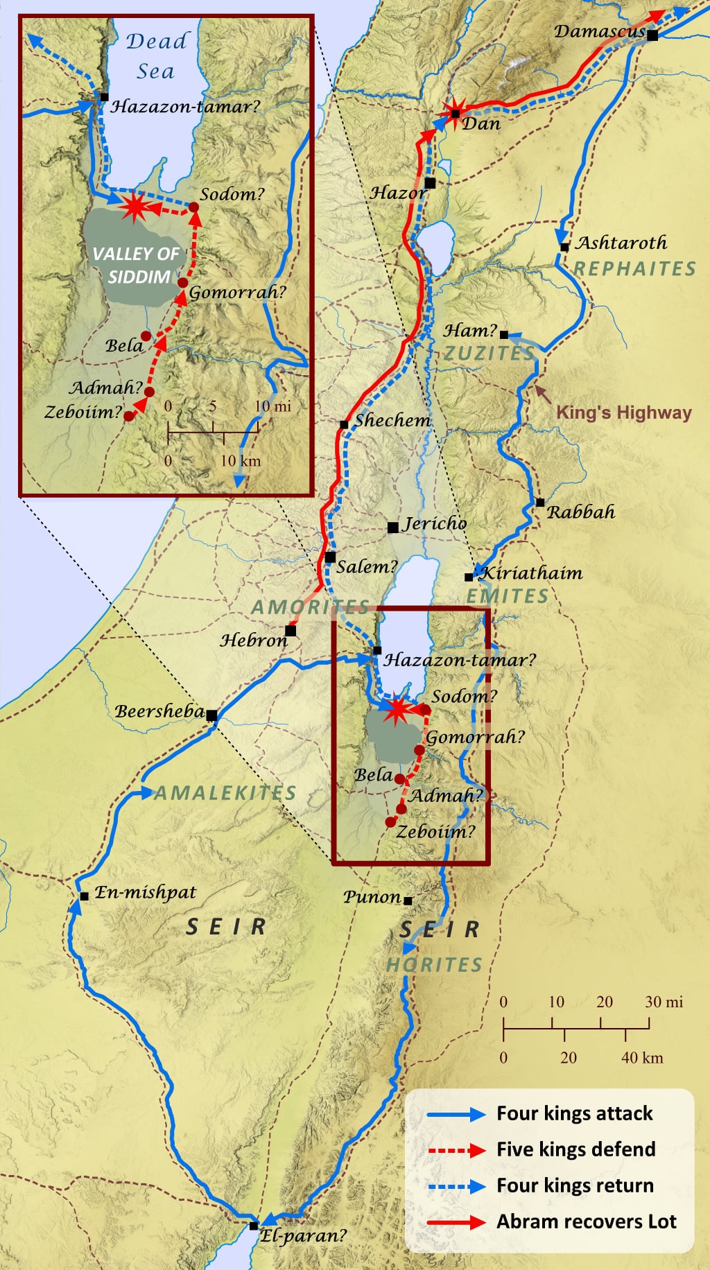 메소포타미아의 네 왕(시날왕 아므라벨, 엘라살왕 아리옥, 엘람왕 그돌라오멜, 고임왕 디달)이 요단 들판의 다섯 왕(소돔왕 베라, 고모라왕 비르사, 아드마왕 시납, 스보임왕 세메벨, 벨라 곧 소알왕)과 싸웠다.