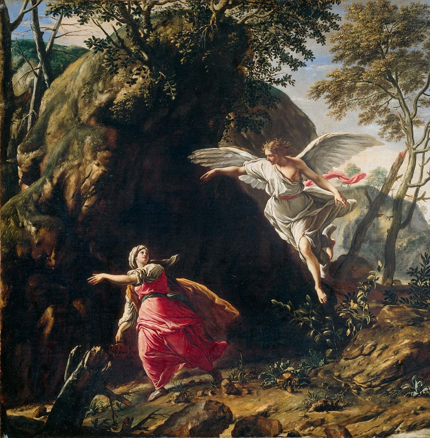 아브람의 아내 사래가 생산치 못하자 애굽 여종 하갈을 아브람과 동침케 했다. 하갈이 잉태하여 여주인을 멸시하자 사래가 하갈을 학대하였더니 여종이 도망쳤다. 도망친 하갈에게 여호와의 사자가 이르러 다시 돌아가 복종하도록 했다.