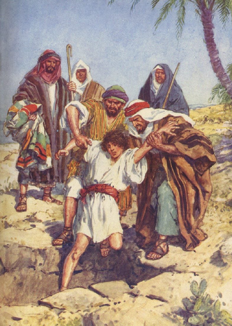 야곱의 명을 받은 요셉이 양을 치고 있는 형들에게 다가가자 그들은 그를 죽이려 했다. 맏아들 르우벤은 나중에 구해주려는 생각에 피를 흘리지 말고 요셉을 구덩이에 던지고 손대지 말라고 하였다. 이에 형제들은 요셉의 옷을 벗기고 구덩이에 던졌다.