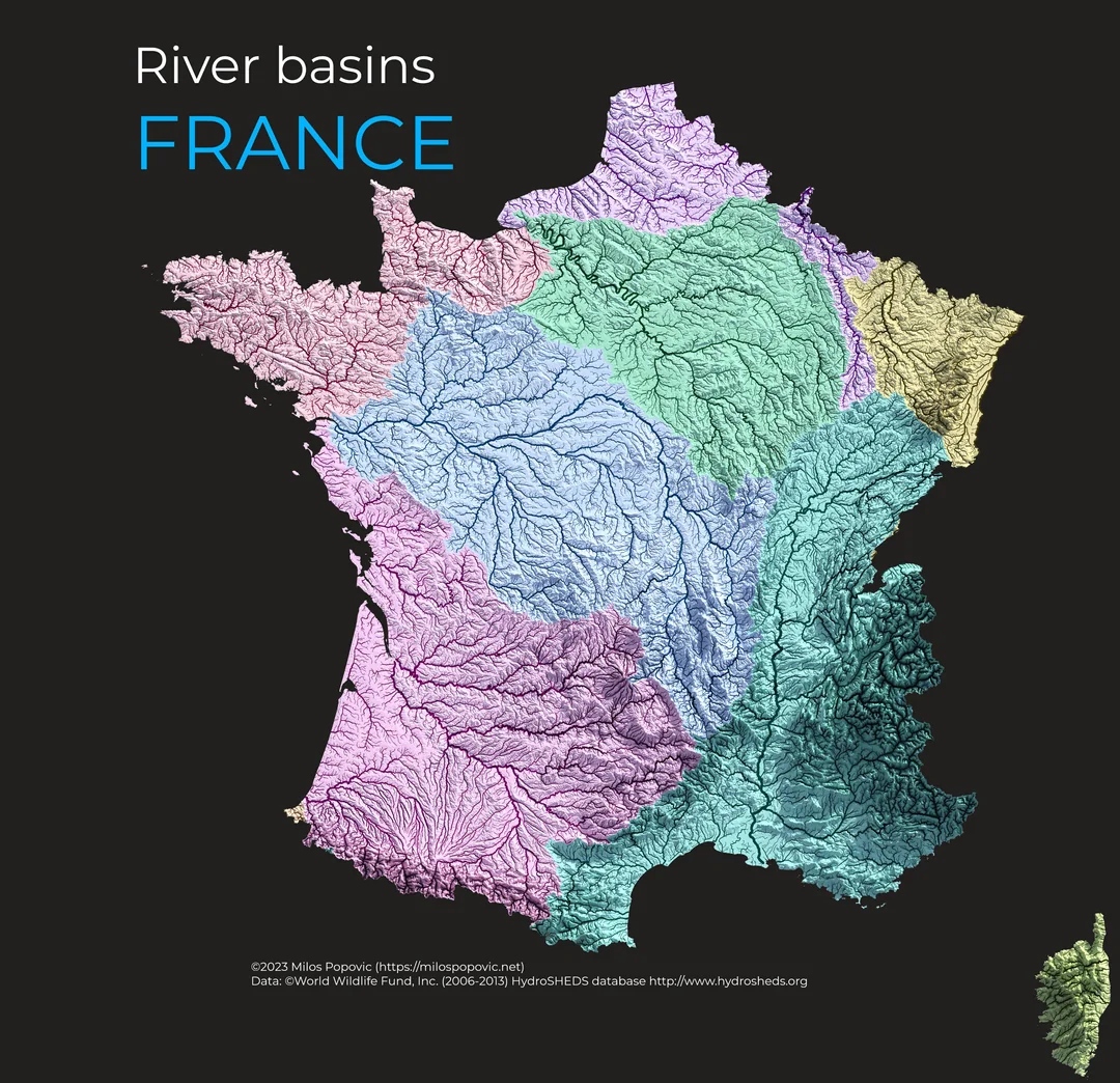 지리학자 밀로스 포포비치는 센 강, 루아르 강, 가론 강, 론 강 등 프랑스의 주요 유역을 보여주기 위해 이 지도를 디자인했다. 이러한 유역을 이해하는 것은 프랑스의 농업, 산업, 정착지가 어떻게 발전했는지 파악하는 데 필수적이다.