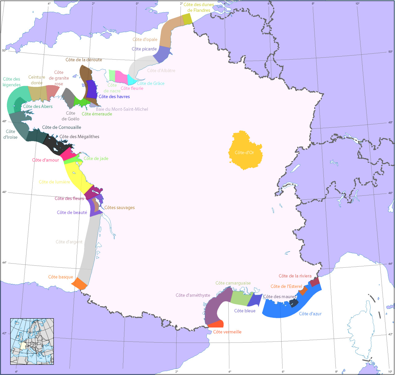 프랑스의 세 해안선, 즉 대서양, 지중해, 해협에는 각각 고유한 성격과 이름을 가진 지역이 곳곳에 있다. 코트다쥐르에서 오팔 해안까지 이 지역은 지리적으로나 관광적으로나 매우 중요한 곳이다.