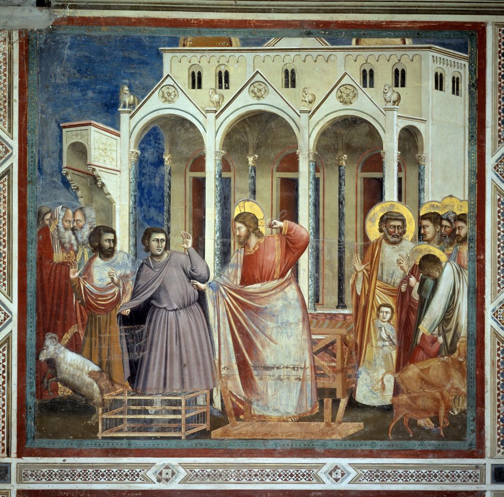 성전에서 상인들을 쫓아내는 예수님. 조토의 프레스코화, 1303-1305
