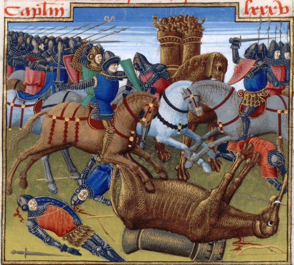 202년 자마(오늘날 튀니지) 전투 / 마레 히스토리아룸(1447-1455)에서 발췌, 폴리오 133v. 에서 발췌 - 출처: 프랑스 국립 도서관