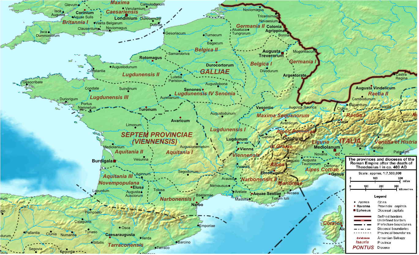 AD 314년 디오클레티아누스 황제의 제국 행정 개편으로 갈리아 나르보넨시스와 갈리아 아퀴타니아 속주는 비엔넨시스 관구라고 하는 새로운 행정 단위로 합병되었으며 주도는 북쪽의 비엔에 있었다. 새로운 관구의 이름은 나중에 디오이케시스 셉템 프로빈키아룸(7개 지방의 관구)으로 변경되었는데 이는 디오클레티아누스가 "속주" 단어를 전통적인 사용법보다 더 작은 구획을 의미하도록 강등했음을 나타낸다.
