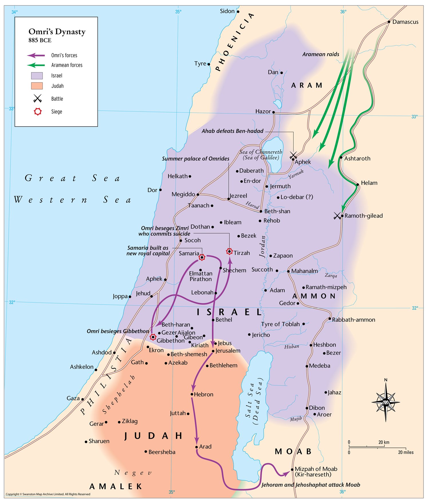반면에 시돈과의 평화는 페니키아의 종교 사상이 왕국에 침투하여 전통주의자들(선지자 엘리야와 추종자들)과 귀족들(오므리의 아들이자 후계자인 아합과 그의 배우자 이세벨이 중심이 된) 사이의 종교 분쟁으로 이어졌다. 외교 문제에서 이 기간은 다마스쿠스에 기반을 둔 아람 왕국의 부상이 함께 있었으며 이스라엘은 곧 북동부에서 전쟁을 벌이게 되었다. 그러나 가장 위협적인 것은 메소포타미아에서 서쪽으로 확장하기 시작한 아시리아의 지배력이었다. 아합을 포함한 지역 왕들의 연합에 맞서 아시리아의 샬마네세르 3세와의 살 떨리는 카르카르 전투(BC 853)는 아시리아와 이스라엘 간의 첫 번째 충돌이었다. 그것은 BC 722년에 북이스라엘 왕국을 멸망시키고 유다 왕국을 아시리아의 속국으로 축소시키는 일련의 전쟁 중 첫 번째 사건이었다.