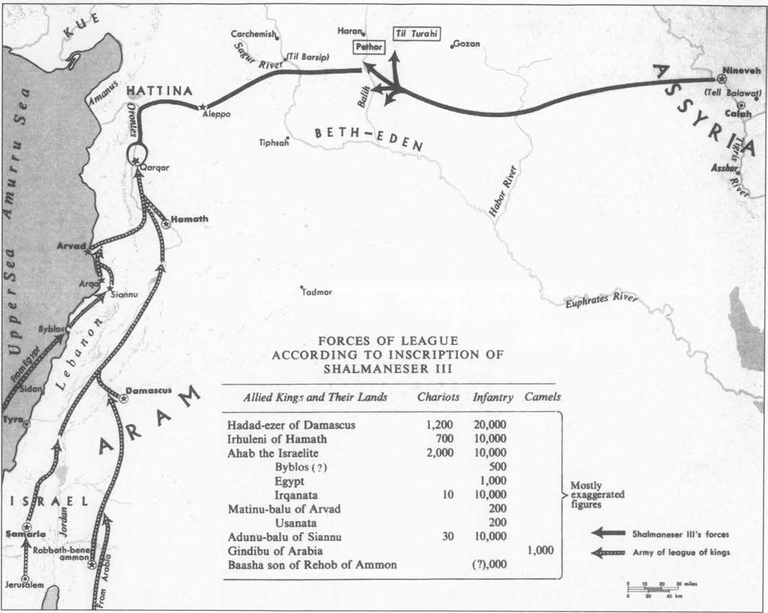 아합의 군세는 전차 2,000대와 병사 10,000명으로 추산된다. 그러나 실제로 아합 군대의 전차 수는 아마도 수백 대에 가까웠을 것이다(이 지역의 고고학적 발굴과 발견된 마구간 터를 기반으로 함). 그러나 숫자가 동맹군을 지칭하는 경우 티레, 유다, 에돔 및 모압의 군대를 포함할 수 있다. 아시리아 왕은 승리를 주장했지만, BC 849년과 846년에 그의 즉각적인 귀환과 불특정 연합에 대한 원정은 그가 지속적인 성공을 거두지 못한 것으로 추정된다. 한편, 히브리 성경에 따르면 7,000명의 군대를 가진 아합은 이전에 사마리아를 포위하기 위해 온 벤하닷과 그의 32명의 왕을 전복시켰고, 이듬해에 아마도 샤론 평야인 것으로 추정되는 아벡에서 그에 대한 결정적인 승리를 얻었다(왕상 20장). 벤하닷은 그의 아버지가 아합의 아버지로부터 빼앗은 도시를 돌려주고 다메섹과 사마리아 사이의 무역 시설이 허용되는 조약이 체결되었다.
